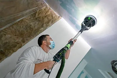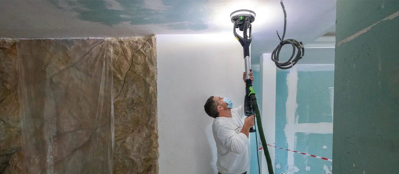 The Didier team is skilfully crafting an exclusive reed decoration on the wall. In the extension, they are giving three columns a marble aesthetic that requires a perfectly prepared substrate, which is then painted and polished. ‘Having the perfect tools for our needs is the most important thing for us,’ emphasises Didier Lebon. He even had a custom smoothing trowel made for his company. Especially high-quality surfaces are created using Festool sanders and abrasives with a grit of up to 4000.